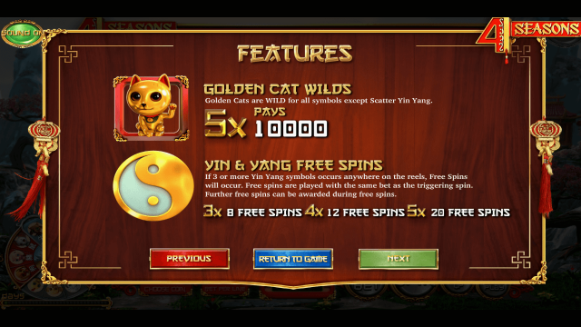Геймер может выиграть до 20 свободных вращений. Фриспины запускают знаки Инь-Янь. Спецсимволы могут выпасть на любых позициях пяти барабанов. За 3, 4 и 5 особых знаков игрок получит 8, 12 и 20 бонусных спинов.