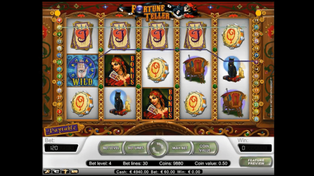В игровом автомате Гадалка 5 активных барабанов, 30 рабочих линий, спецсимволы, бонусный раунд и автоплей. Диапазон ставки — от 1 до 5 монет, стоимостью от 1 до 50 центов. Выбрать размер ставки пользователь сможет самостоятельно. Новичкам стоит начинать с минимальной суммы.