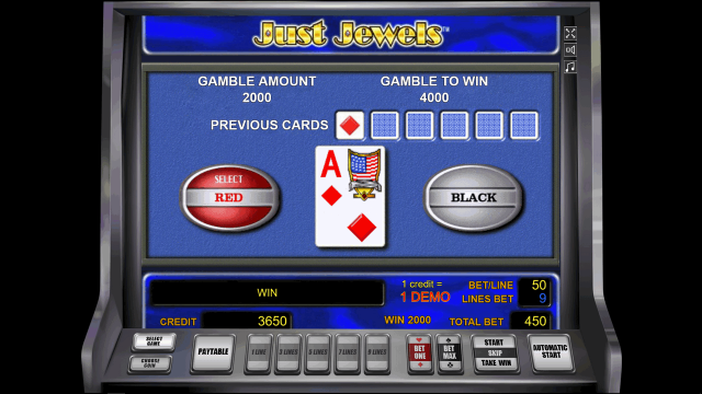 Еще одна полезная опция аппарата Just Jewels — риск-игра. Пользователь может перейти после любого раунда, в результате которого выпала призовая комбинация. Ставкой в риск-игре служит приз за предыдущий спин. Если игрок одержит победу в дополнительном раунде, его сумма увеличится вдвое. В случае проигрыша она сгорает. Правила игры на удвоение очень просты — необходимо угадать цвет перевернутой рубашкой вверх игральной карты.
